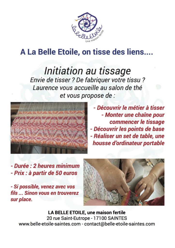 - Vendredi et lundi de 15h à 19h : Tricot'Thé", Tiss'O'Thé, Brod'O'Thé. Vous aimez les fils, soyez bienvenus à La Belle Etoile pour tisser, tricoter ou broder quelques brins de fils ensemble. Et même si vous venez sans vos fils, vous tisserez sans doute quelques liens le temps d'une pause gourmande !