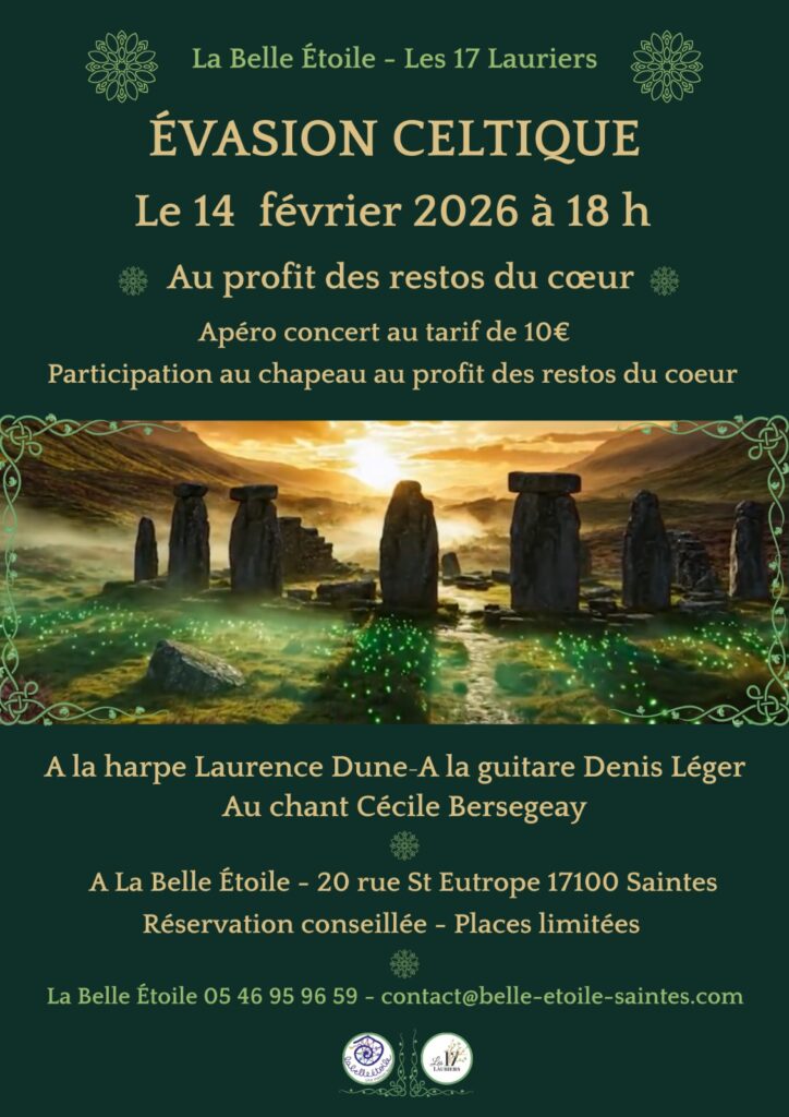 - "Evasion Celtique" ! Vous avez aimé les chansons celtiques avec Cécile (voix), Denis (guitare) et Laurence (harpe) ? Le fil continue et nous vous proposons un début de soirée en musique : voyage musical suivi d'un apéro étoilé. Apéro 10 euros - Concert au profit des Restos du Cœur. Au plaisir de partager avec vous quelques notes celtiques. Réservation obligatoire avant le 12 Février au 06 08 07 41 92.