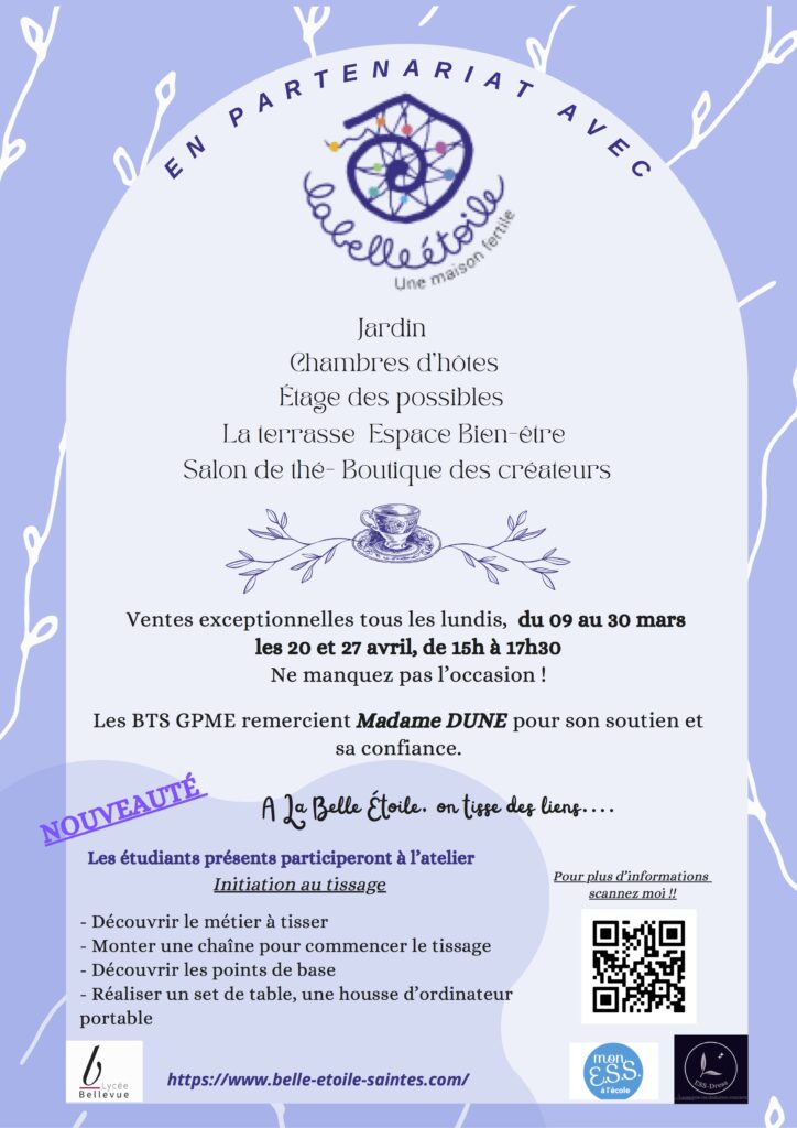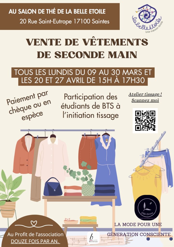 Pour la deuxième année, La Belle Etoile accueille des étudiants en BTS Gestion des PME du lycée Bellevue de Saintes pour une vente de vêtements de seconde main au profit de l'association Douze fois par an. Cette année, ils participeront aussi à l'atelier tissage. N'hésitez pas à venir les rencontrer tous les lundis du 9 au 30 mars et les 20 et 27 avril de 15h à 17h30.