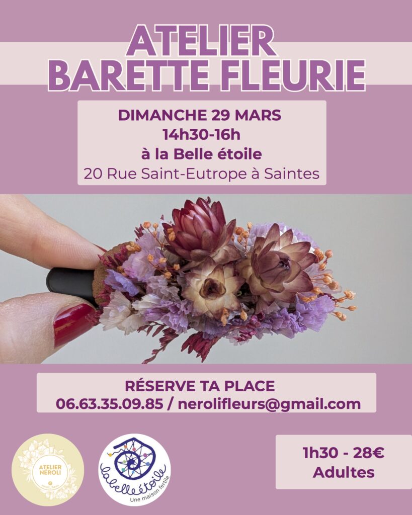 - Dimanche 29 mars de 14h30 à 16h30 : atelier "décoration"Barette fleurie" avec Anaïs / Néroli Fleurs. Renseignements et réservation au 06 63 35 09 85.