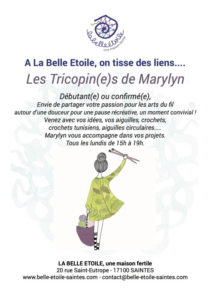 - Vendredi et lundi de 15h à 19h : Tricot'Thé", Tiss'O'Thé, Brod'O'Thé. Vous aimez les fils, soyez bienvenus à La Belle Etoile pour tisser, tricoter ou broder quelques brins de fils ensemble. Et même si vous venez sans vos fils, vous tisserez sans doute quelques liens le temps d'une pause gourmande !