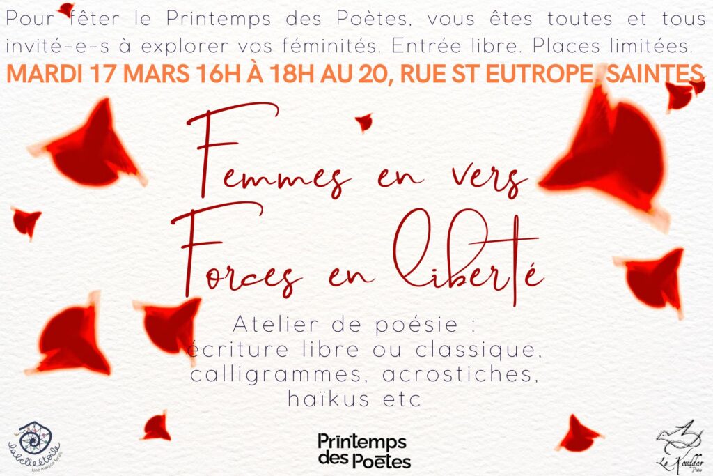 - Mercredi 17 mars de 16h à 18h : atelier de poésie avec Le Kouddar dans le cadre du Printemps des Poètes. Réservation au 06 20 37 83 97.
