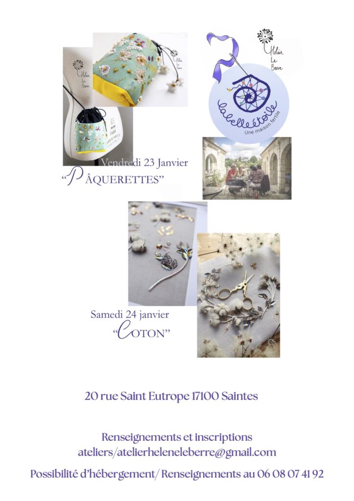 - Vendredi 23 et Samedi 24 Janvier 2026 : l'artiste brodeuse Hélène Le Berre propose un atelier de broderie. Renseignements et réservation atelierheleneleberre@gmail.com. Possibilité d'hébergement à La Belle Etoile. Réservation ici.