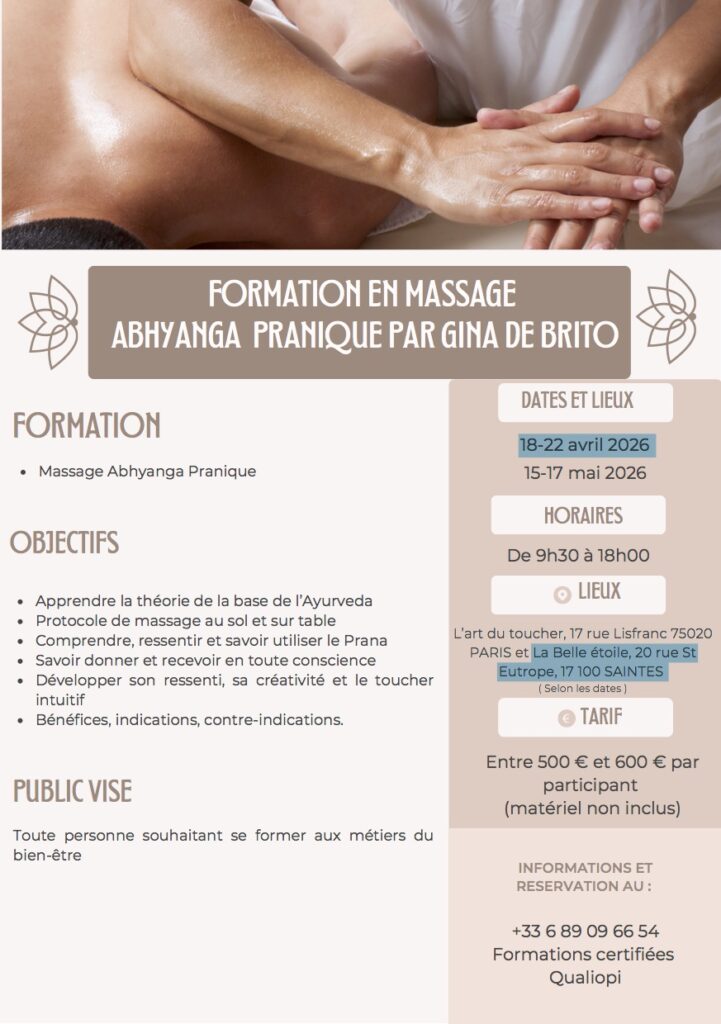 - Du 18 au 22 Avril : formation en massage Abhyanga pranique avec Gina De Brito. Renseignements et réservation au 06 89 09 66 54.