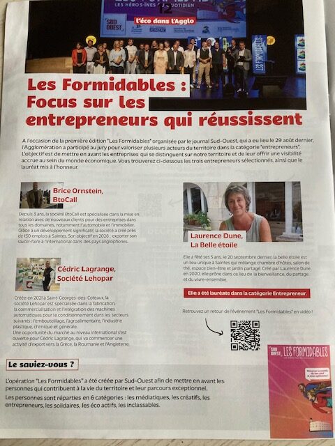 Merci Le Mag de l'Agglo de Saintes Grandes Rives pour son focus sur Les Formidables lancées par Sud-Ouest qui a récompensé La Belle Etoile dans la catégorie "Entrepreneurs" :